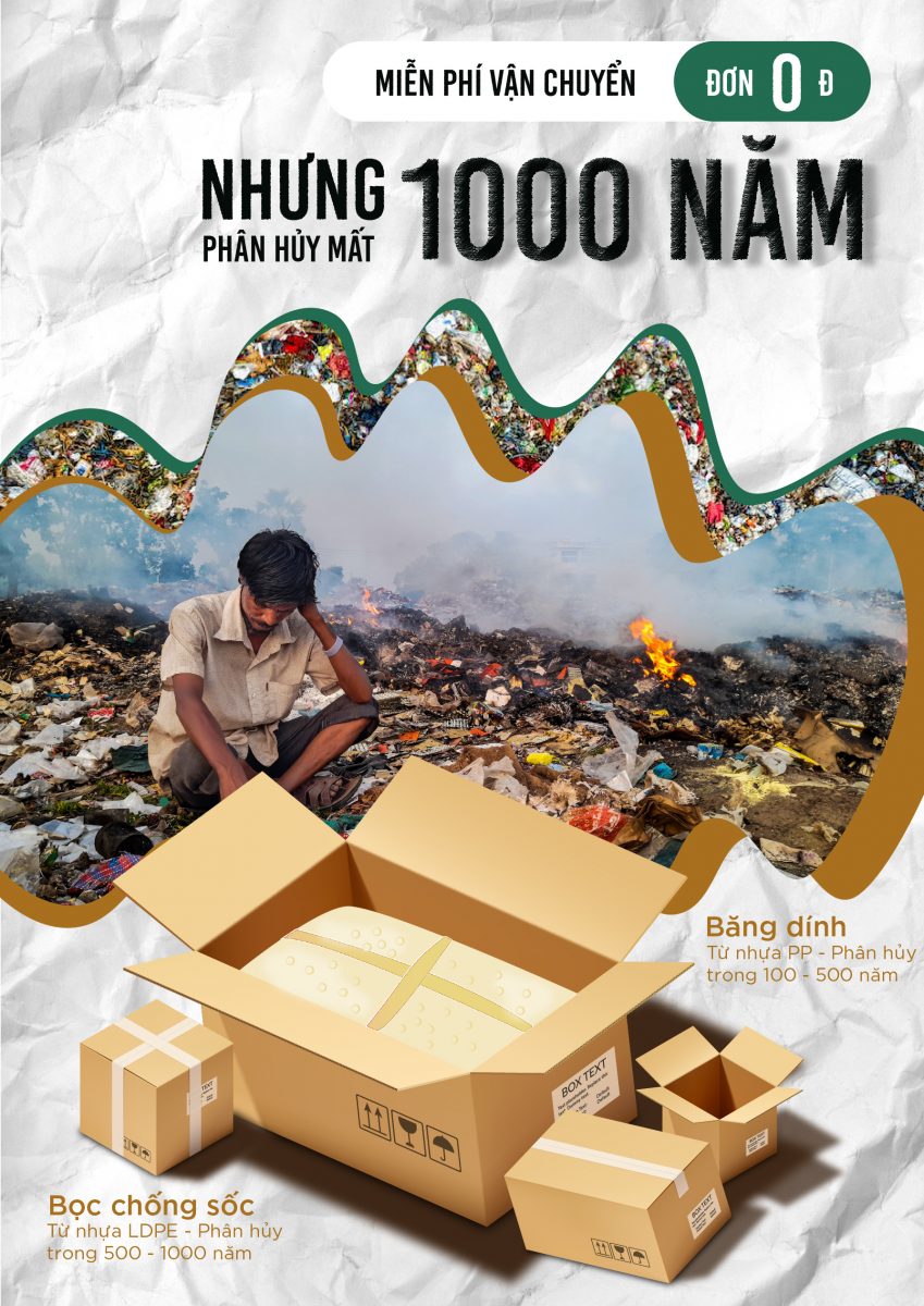 Ngày nay, khi mà mạng xã hội ngày càng phát triển, cũng là lúc mà các sàn thương mại điện tử hoạt động mạnh hơn bao giờ hết. Các chiến dịch quảng bá cũng cứ thế tăng lên chóng mặt, và đương nhiên là người ta được lợi rất nhiều từ sự phát triển đó. Về phía người bán, họ thu về được một nguồn lợi nhuận khổng lồ từ việc kinh doanh trên mạng xã hội, trên các sàn thương mại điện tử. Về phía người mua, người ta được hưởng rất nhiều ưu đãi về giá cả cũng như phương thức thanh toán, vận chuyển. Khách hàng chỉ cần bấm vài nút, làm vài thao tác là đơn hàng sẽ được chuẩn bị và giao đi nhanh chóng. Nhưng mọi người có biết rằng rác thải đến từ chúng nhiều như thế nào không? Đặc biệt là với những đơn “0 đồng”. Cái giá bạn phải trả cho đơn hàng là 0 đồng tiền mặt, nhưng cái giá bạn trả cho môi trường là bao nhiêu? Vâng, là tối đa 1000 năm để rác thải nhựa đến từ những đơn hàng đó có thể phân hủy. Bạn cứ đặt hàng không kiểm soát với cái suy nghĩ “Chỉ có 0 đồng thôi mà, tội gì mà không đặt”. Nhưng bạn đâu biết rằng chính những hành động đó của bạn đã góp phần làm cho Trái Đất có thêm cả tấn núi chất thải mỗi năm và vẫn chưa có dấu hiệu dừng lại, rồi một ngày nào đó có lẽ mình sẽ phải ngồi trên chính những đống rác mà mình đã tạo ra. Qua tác phẩm này, mình muốn mọi người hiểu được rằng, Đơn hàng 0 đồng chỉ mất vài giây để đặt, nhưng để phân hủy phải tiêu tốn 1000 năm của môi trường. Vậy nên hãy giảm bớt tối đa việc đặt những đơn hàng không cần thiết, thứ gì có thể mua được hãy tự đi mua, vì một Trái Đất xanh, sạch, đẹp và cũng vì tương lai được sống trong một thế giới tốt đẹp hơn.